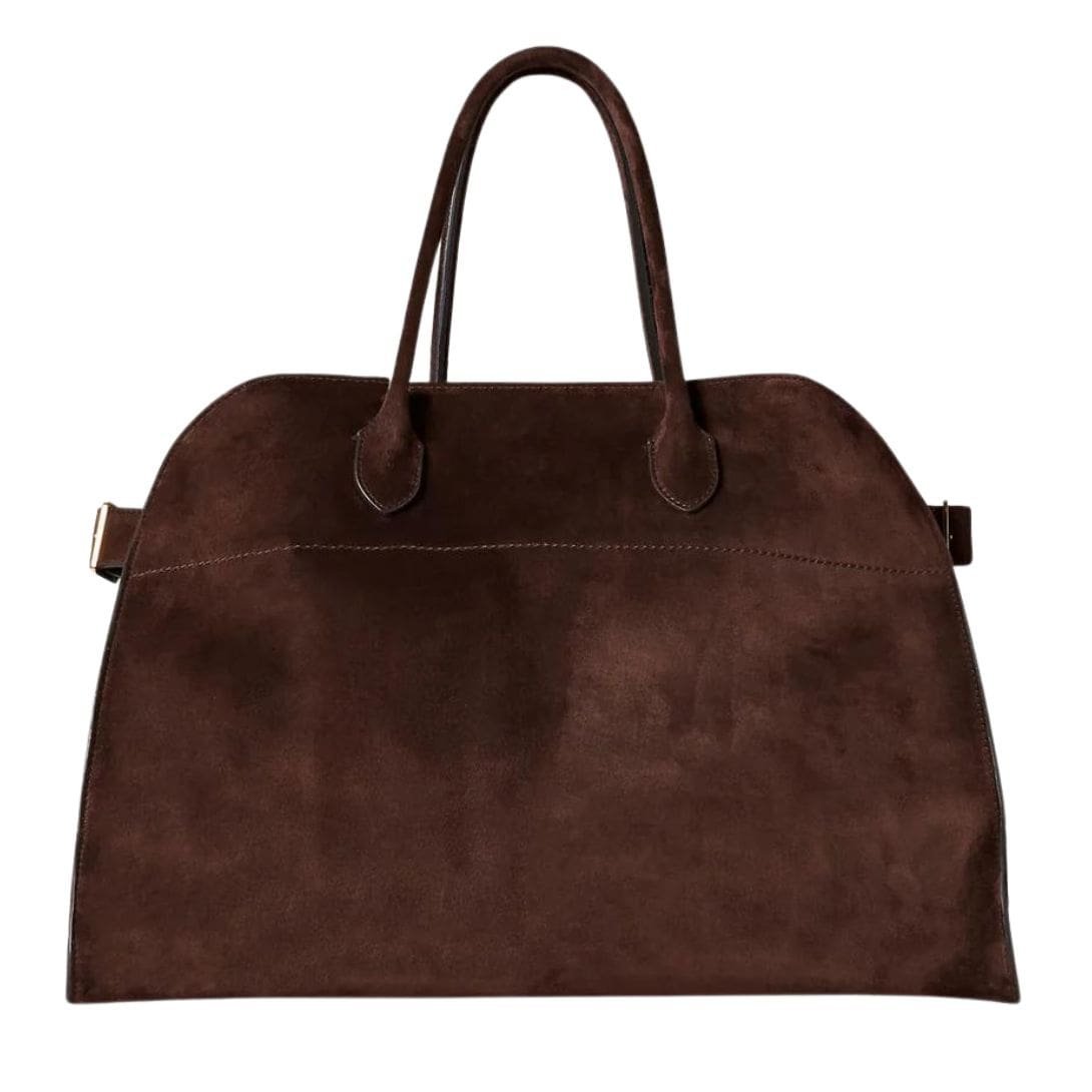 The Row Soft Margaux 15 bag in suede is a statement piece that seamlessly blends luxury with understated elegance. This bag is an epitome of refined craftsmanship, featuring a soft, supple suede exterior that exudes a sense of sophistication. The material choice not only adds a tactile element of luxury but also imbues the bag with a rich, matte finish that subtly enhances its visual appeal.